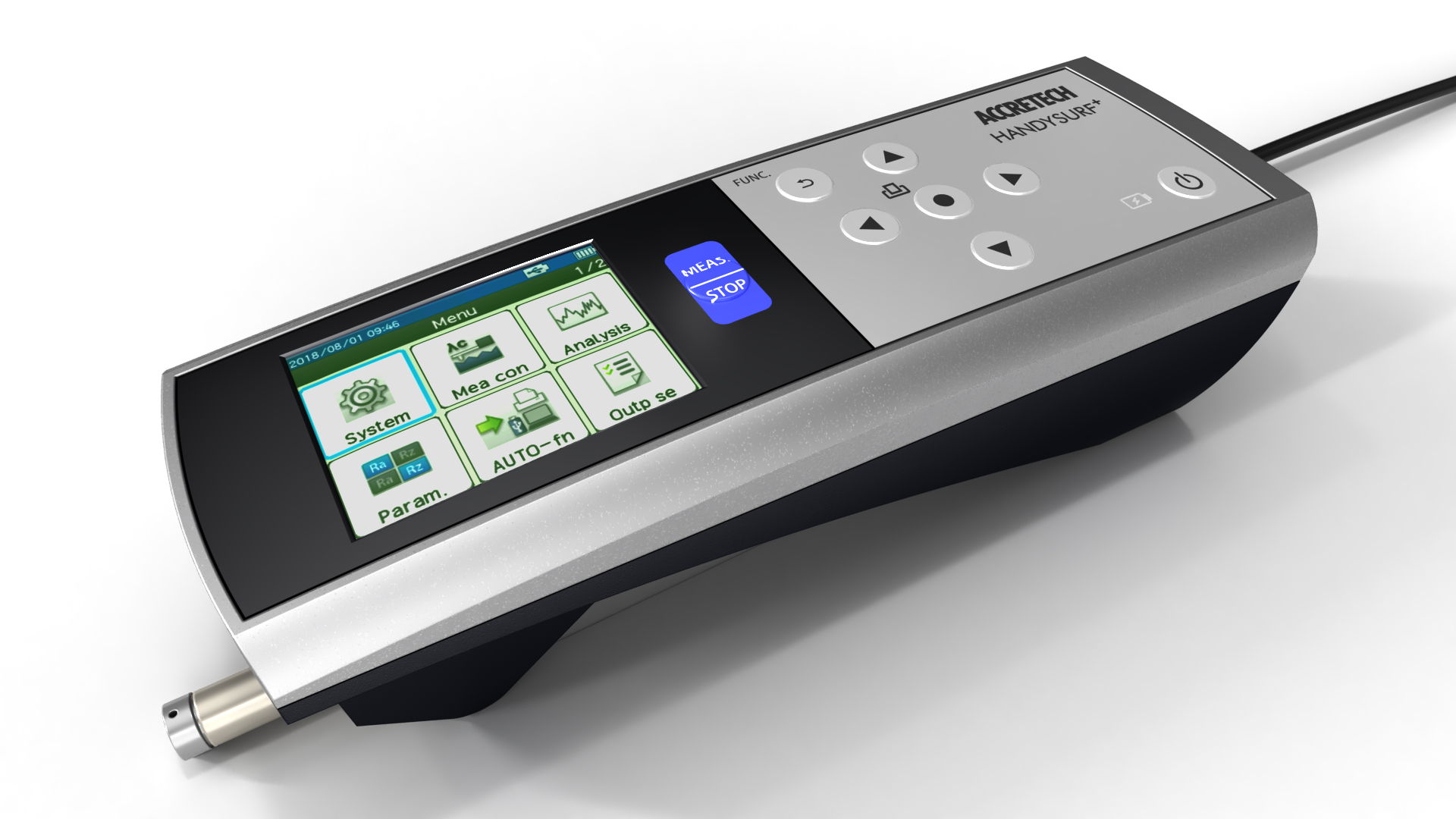 Building on the global success of the company’s previous HANDYSURF instrument, ACCRETECH’s HANDYSURF+ features an ergonomic design, a simple operating system and intuitive software. Also, whereas the original HANDYSURF model required users to set a narrow range when measuring with a high resolution, the new, user-friendly HANDYSURF+ dispense with this requirement. The advanced new instrument has a generous Z direction measuring range of 370 µm, the widest in its class, and achieves a resolution as high as 0.0007 µm over its entire range.