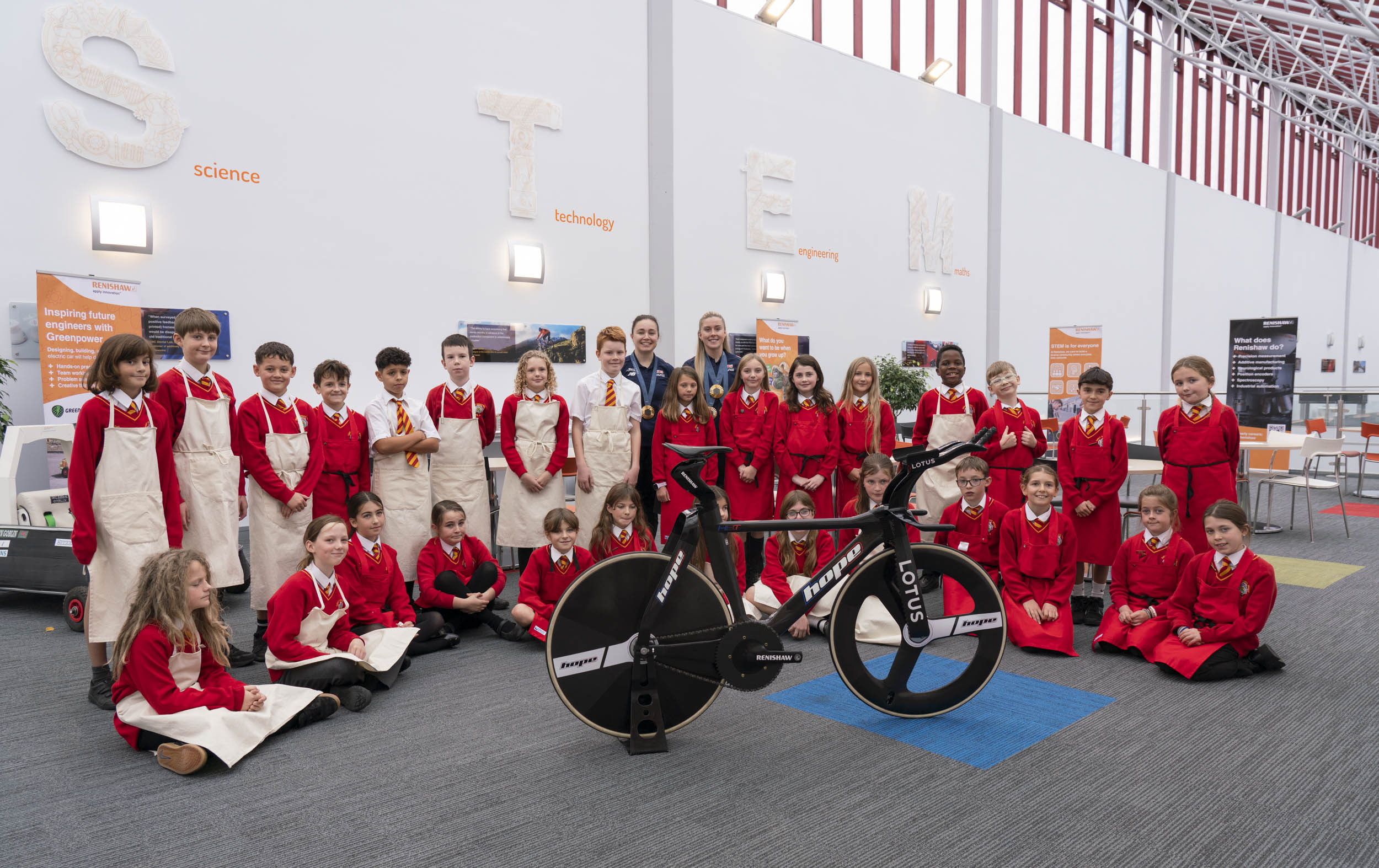 A highlight of the day included a session in Renishaw’s STEM Centre with Caroline Spanton, CEO of Beicio Cymru, who teamed up with Emma and Sophie to guide local students from St. Brides Primary School, through a creative workshop where they designed their dream bicycles. Engaging the students in hands-on STEM activities, the workshop underscored the importance of innovation in sport and sparked the students’ curiosity. Each student left with a signed postcard from Emma and Sophie, and the school received a signed cycling jersey to commemorate the inspiring event.