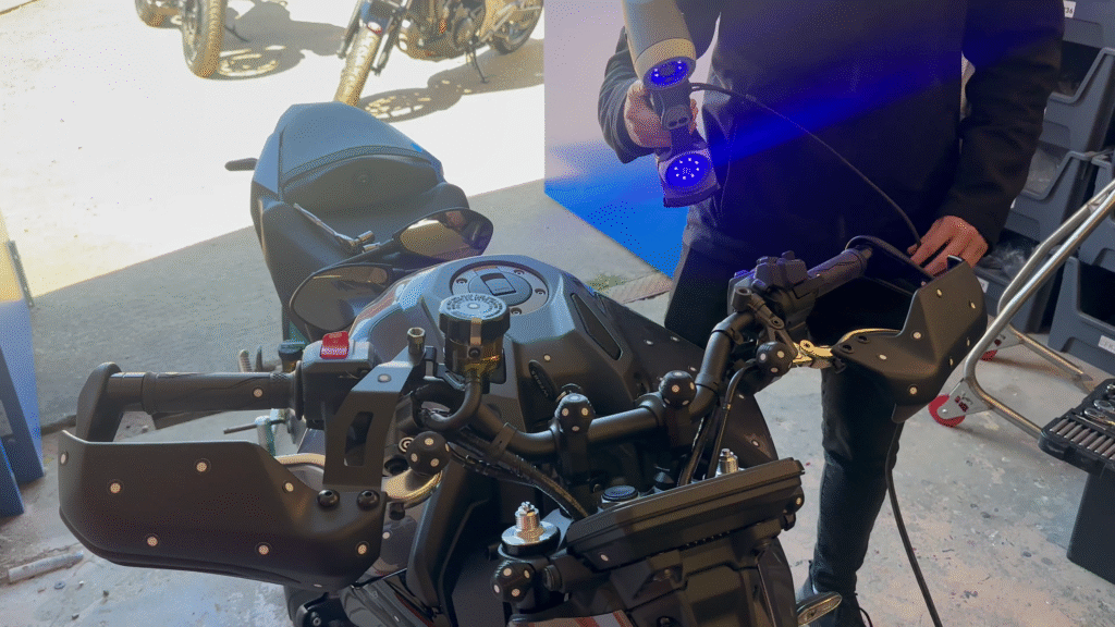 The Pyramid team adopted the Creaform HandySCAN Silver Elite, a handheld, metrology-grade 3D scanner suitable for capturing complex geometries directly on motorcycle bodies.